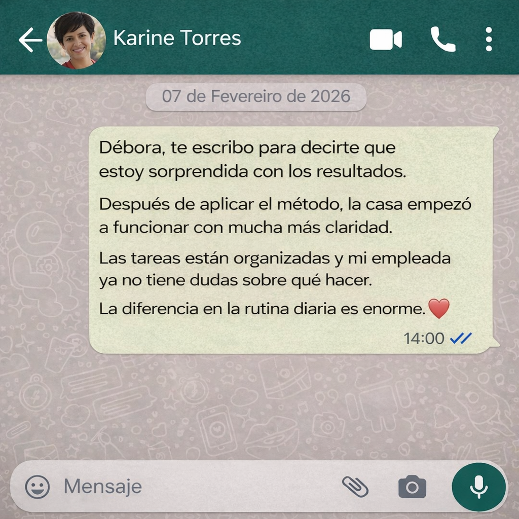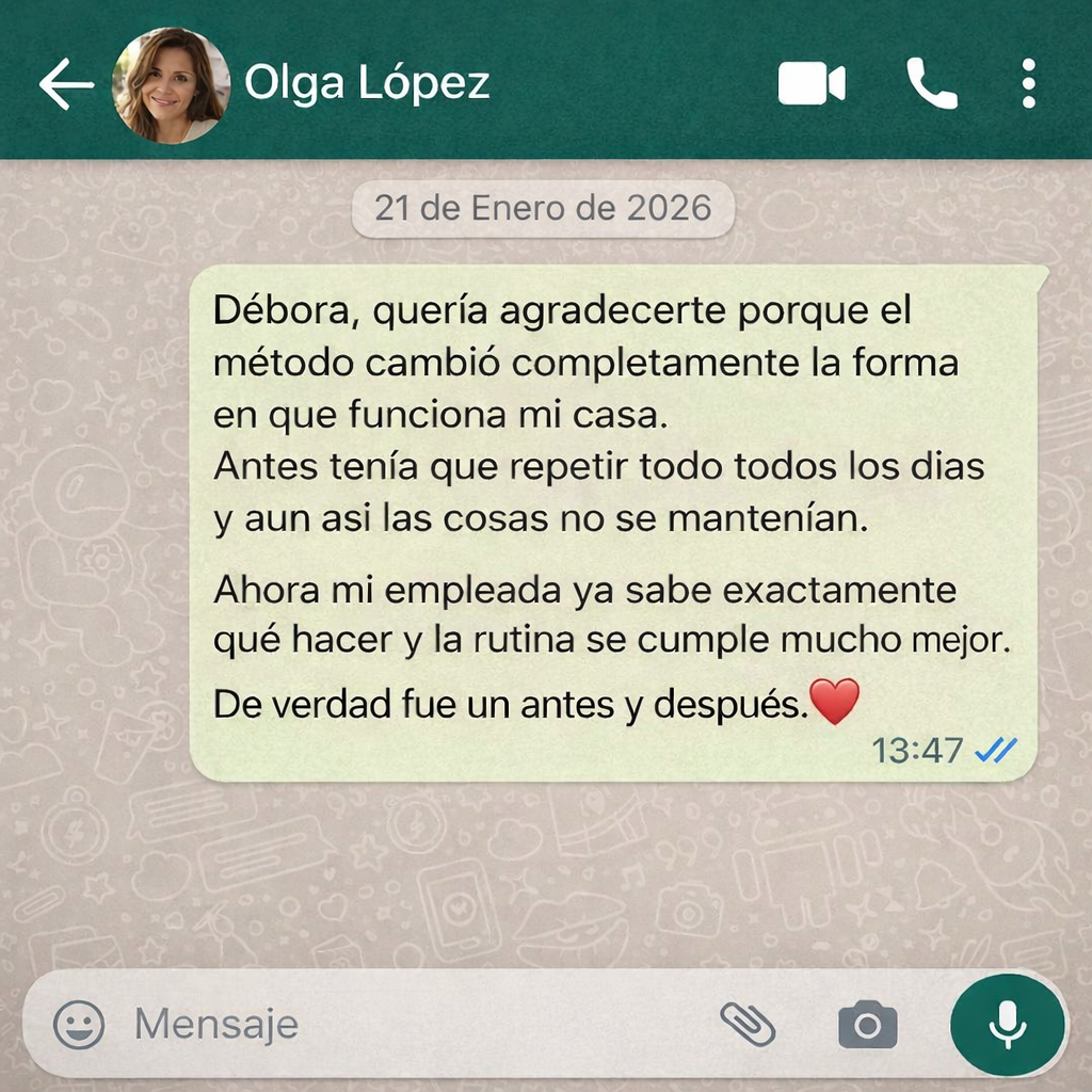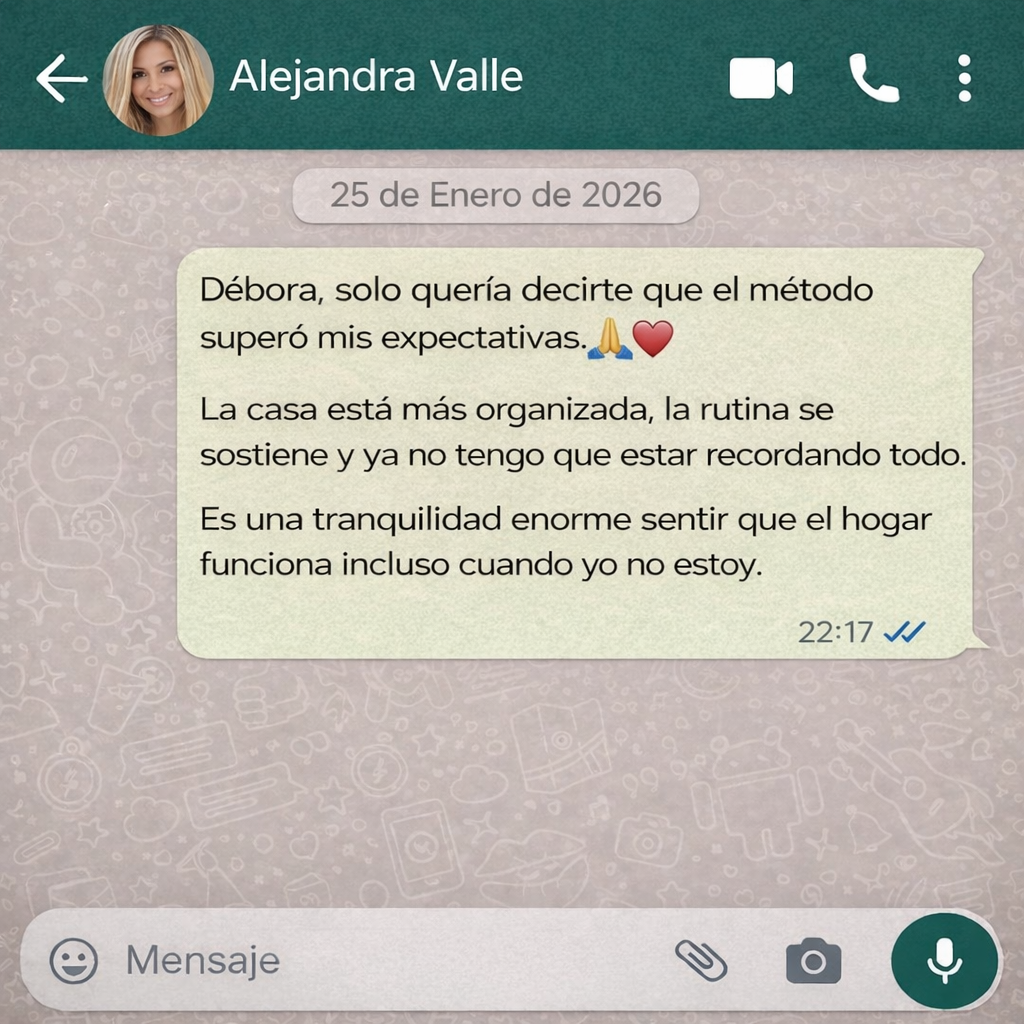 Su enfoque une gestión, organización, inteligencia emocional y liderazgo doméstico, creando un método que respeta la vida real — sin rigidez, sin sobrecarga y sin improvisación constante.